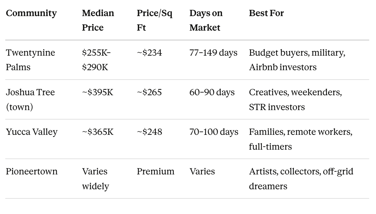 What are home prices like in the Joshua Tree area? As of late 2025: Twentynine Palms median $255,000–$290,000. Yucca Valley around $365,000. Joshua Tree town near $395,000. Pioneertown varies widely. All represent significant value by California standards.